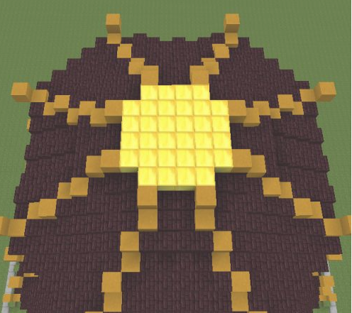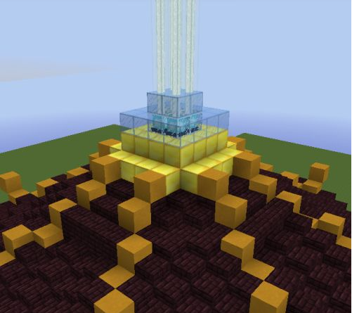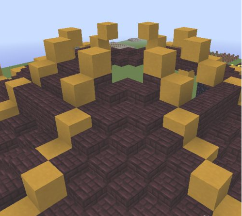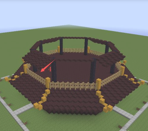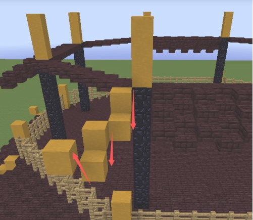 25.中間區域填滿地獄磚,然後從黃色柱子向內收一格,向前推3格的區域放8格高的黑曜石。黑曜石上面再放3格黃色粘土。