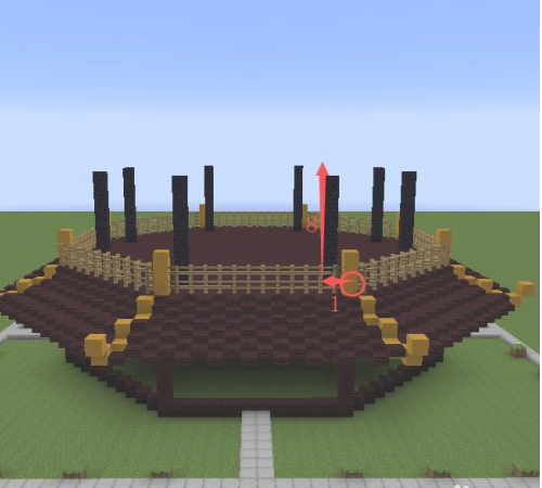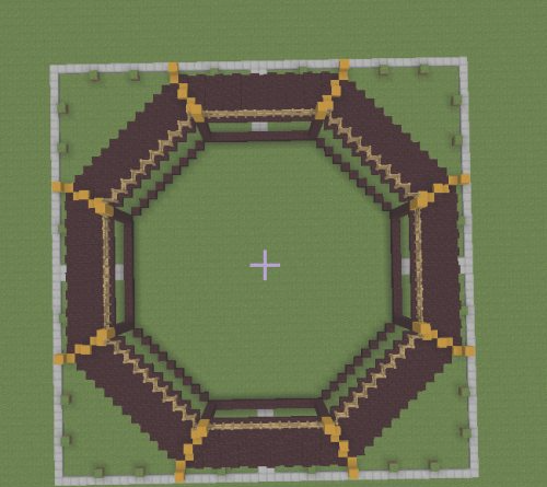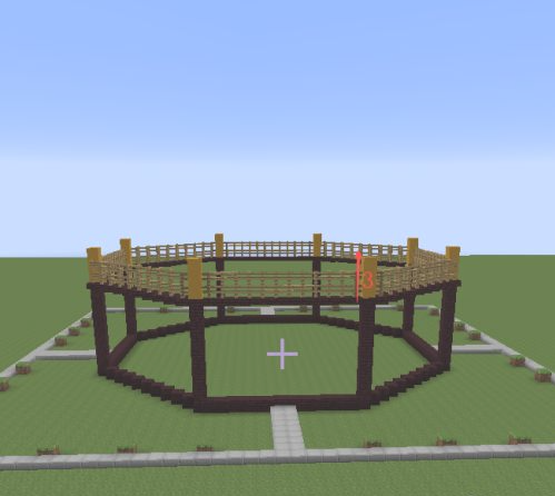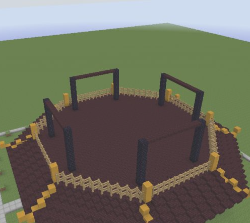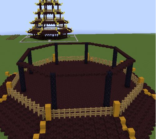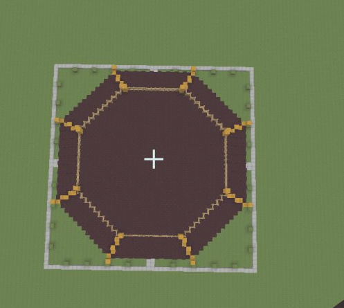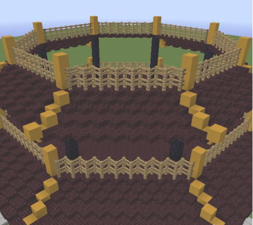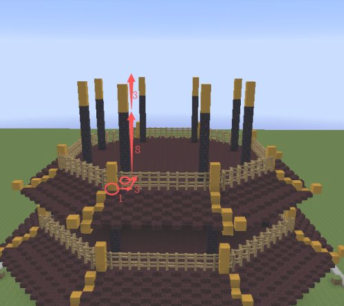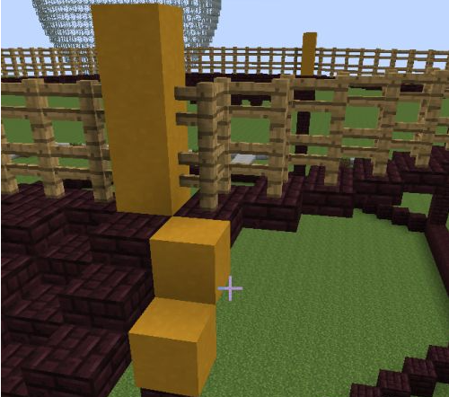 6.在八格的地獄磚上面再提高三格的黃色粘土。然後用地獄半磚跟第一層一樣的做法連接成八邊形,並在上面放置木柵欄。