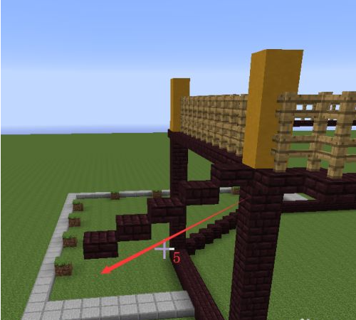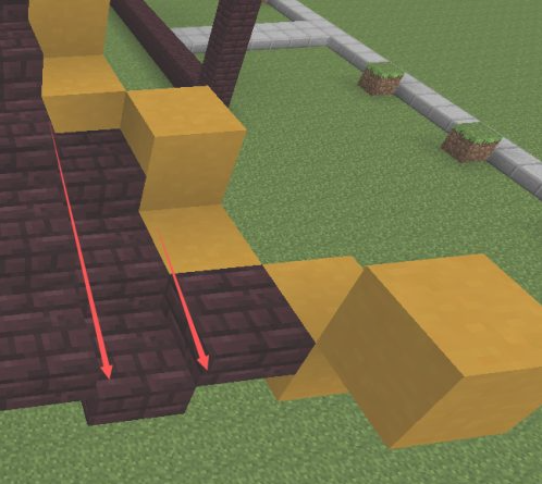 7.然後從直邊的一個邊開始向另一個邊鋪一個向下的坡度。第一個地獄半磚是跟柱子一樣高的。