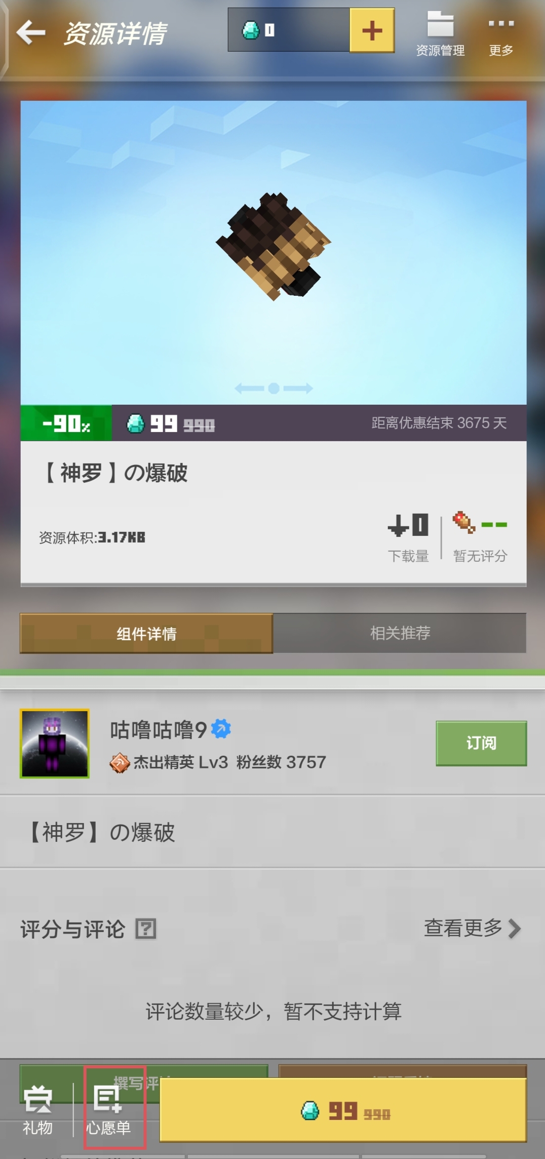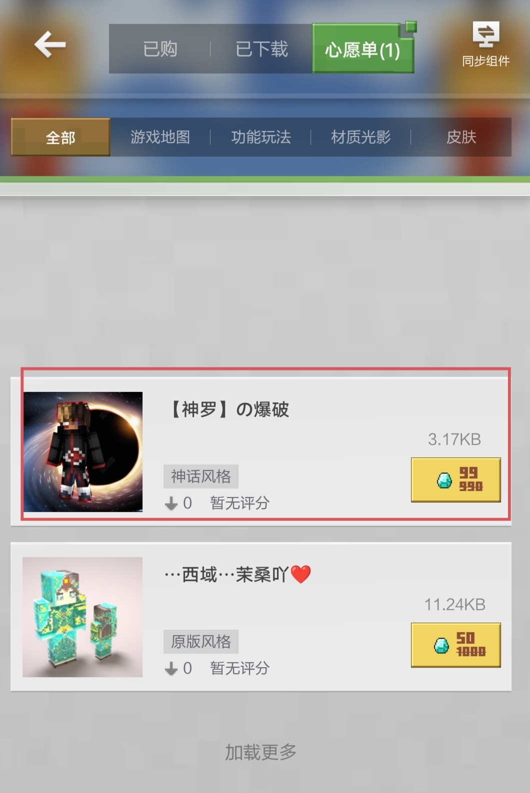 1.首先在我的世界資源中心中找到想加心願單的皮膚或者模組,在該皮膚或者模組的詳情頁面的最下方有一個心願單,點擊心願單就可以把這個皮膚或者模組加入心願單。