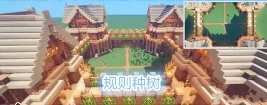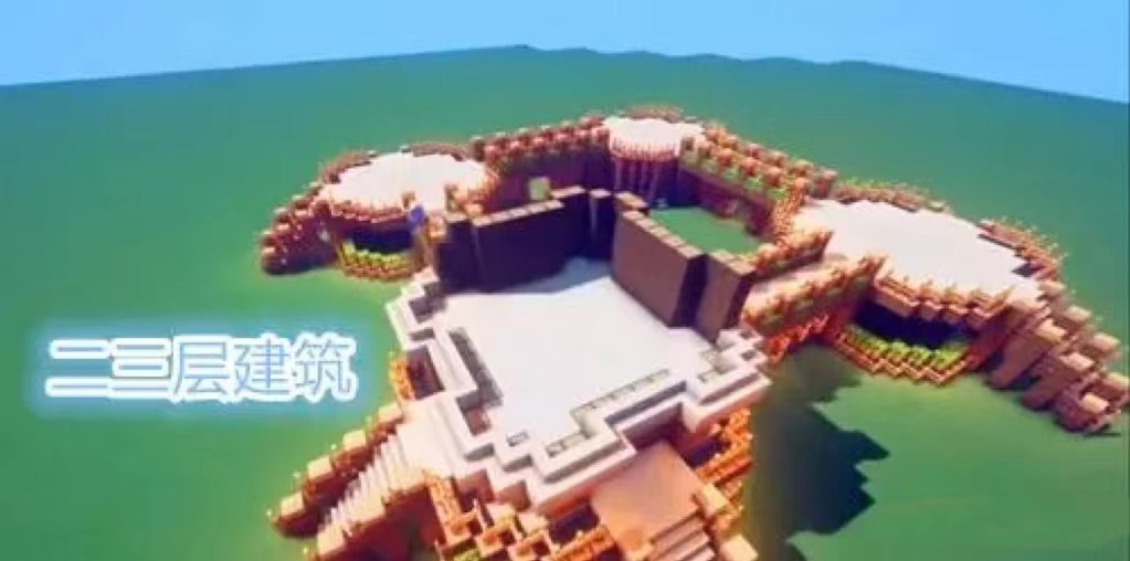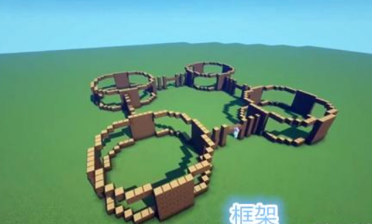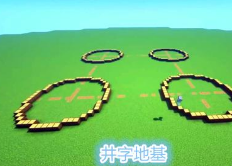 2、接著就是地基的創造,地基對房屋的構建至關重要,正如我們從圖片中看到,這座城堡由四座房屋連接而成,因此我們可以使用「井」字構建地基,以「井」字拐點為軸,創建四個圓形,然後除去「井」字建築