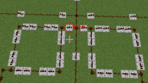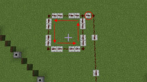 13.第十三步從第十六格向左放一個紅石中繼器與一個紅石,然後放兩個紅石中繼器,按照順時針放置形成一個閉環。