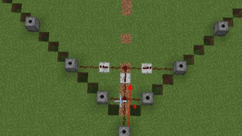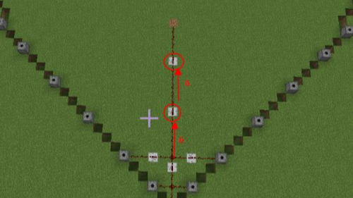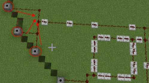 10.第十步從底部最後一個發射器出發4格放一個紅石中繼器,用紅石分別連接附近的發射器。