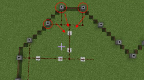 17.第十七步將左右兩側的兩個發射器與閉環用紅石連接。