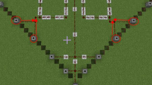 20.第二十步將右側也是同樣的方法,這里的紅石與紅石中繼器的擺放可以隨意一點,只要能將發射器都連接在一起即可。沒必要追求必須對稱。