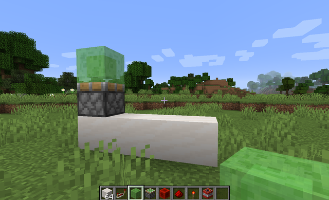 1、首先我們先用普通方塊搭出1*4的底座,並在尾端放置一個向上的粘液活塞,粘液活塞頂端放置一個粘液塊。