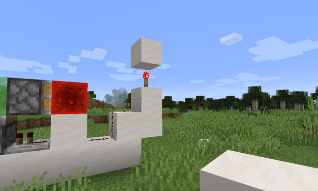 4、搭建完成後將台階最上層的方塊上放置一個紅石火把,另外兩階放置紅石粉連接(此時紅石粉未充能),然後在紅石火把上放置一個石英塊。