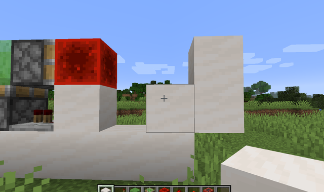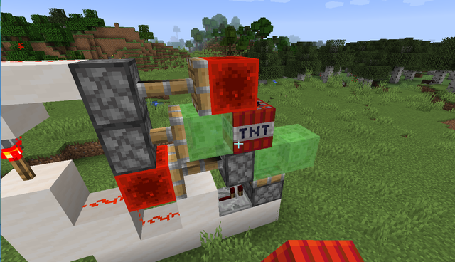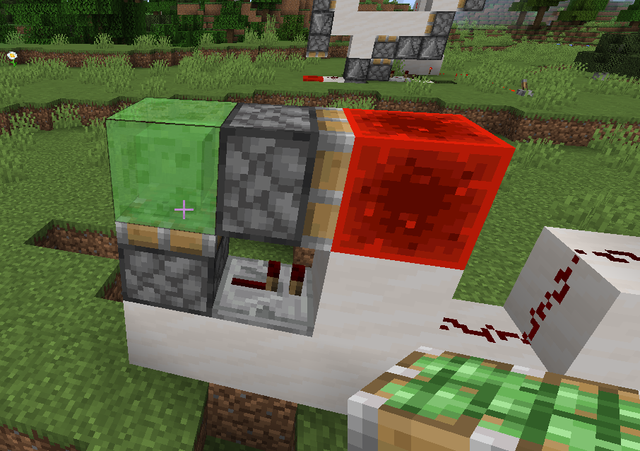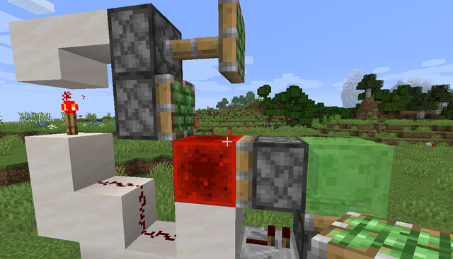 6、在紅石塊上放置一個粘液塊,此時x方向的加速度裝置也做好了,在最上方的粘性活塞(激活的那個)上粘一個紅石塊,整體就完成了!
