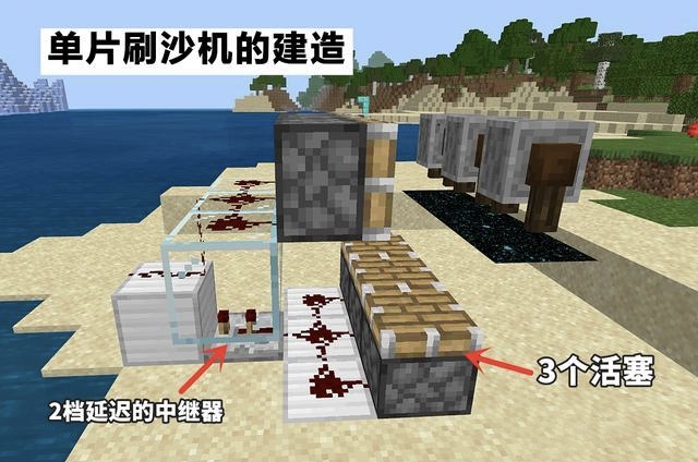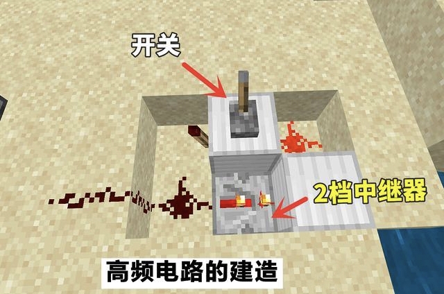 3、高頻電路的建造。使用時打開拉桿,機器便會自動工作。從單片刷沙機的結構而言,絲毫沒有任何難度可言,更沒有涉及到高深的紅石知識。唯一可能出錯的便是兩處中繼器延遲檔位的設置。