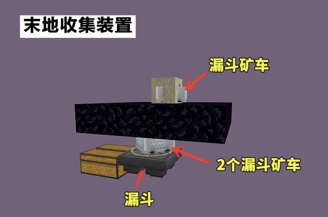 4、收集裝置。主世界的刷沙裝置完成後,便需要來末地修建收集裝置。由於沙子是定點掉落,所以只需要在黑曜石平台下用漏斗礦車收集上方的沙子即可。
