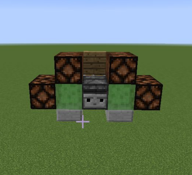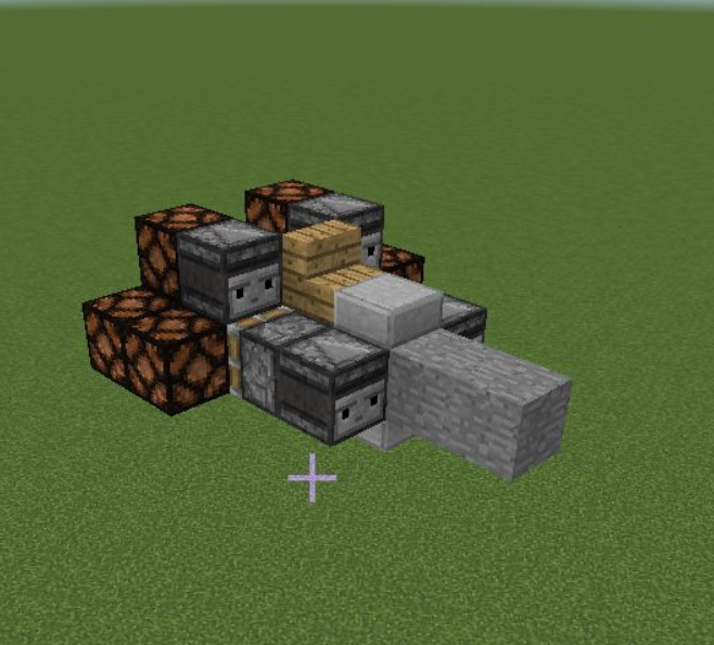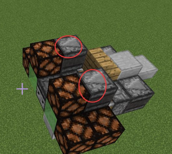 8、作為機頭的粘液塊前方放兩個石頭。樓梯前方的粘液塊上方放一個半磚。