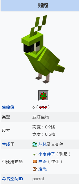 首頁 我的世界 問答 我的世界鸚鵡吃什麼才能馴服? 2022-09-08 我的世界鸚鵡馴服方法解析如下:鸚鵡喜歡吃的食物就是小麥種子,準備的時候玩家不要只準備一點的小麥種子,需要大量的小麥種子才有機會馴服鸚鵡。馴服的時候玩家就需要給鸚鵡餵食小麥種子,在餵食的過程中要有耐心。