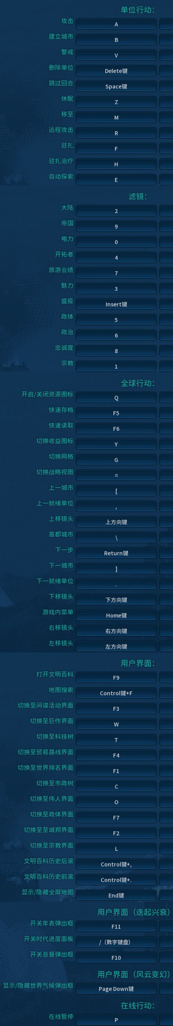 文明6中的快捷鍵如下圖所示,有單位行動、全球行動、用戶界面等幾個類別。