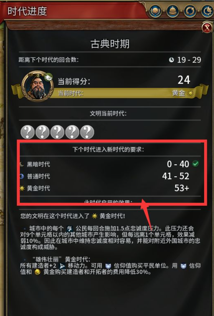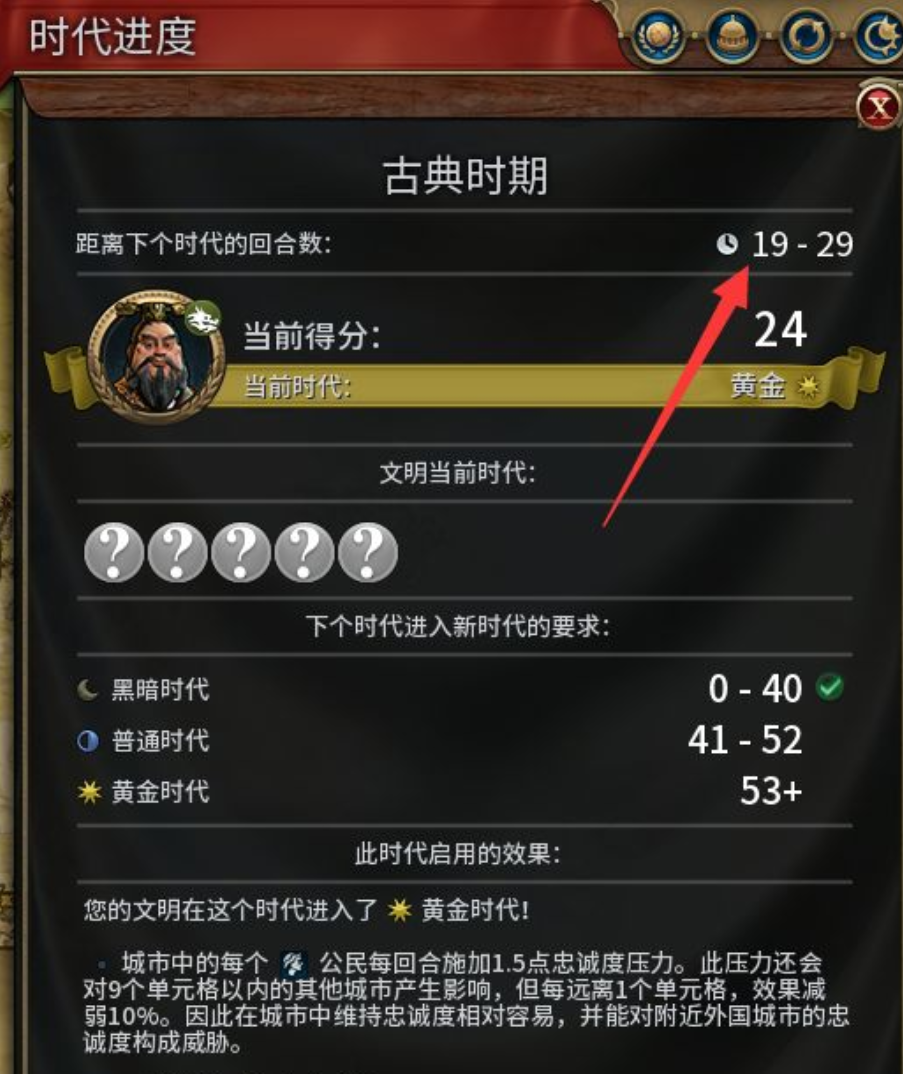 首頁 文明6 問答 文明6怎麼進入下一個時代? 2022-09-09 1、點擊右上角可以看到每次進入下一個時代大概會有幾個回合。2、結果相應回合後玩家查看自己的分數,達到對應的分數就會進入到不同的時代。
