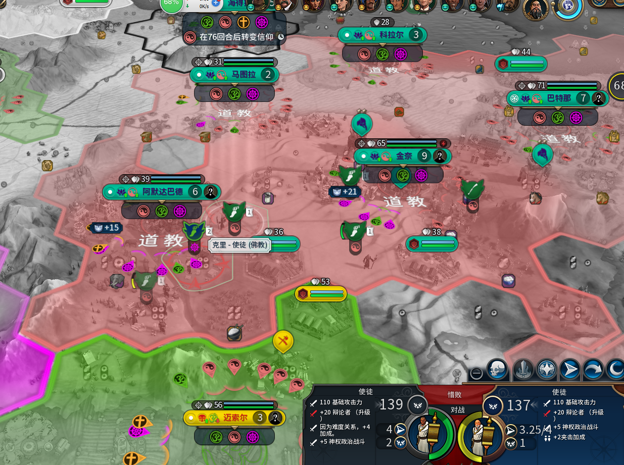 你只需要站在別人的聖地附近,因為宗教單位在自己聖地上面加15力,你的使徒很快就會死了。或者去和其他教的使徒打架,打不過死了就是殉教。