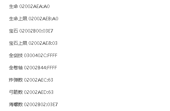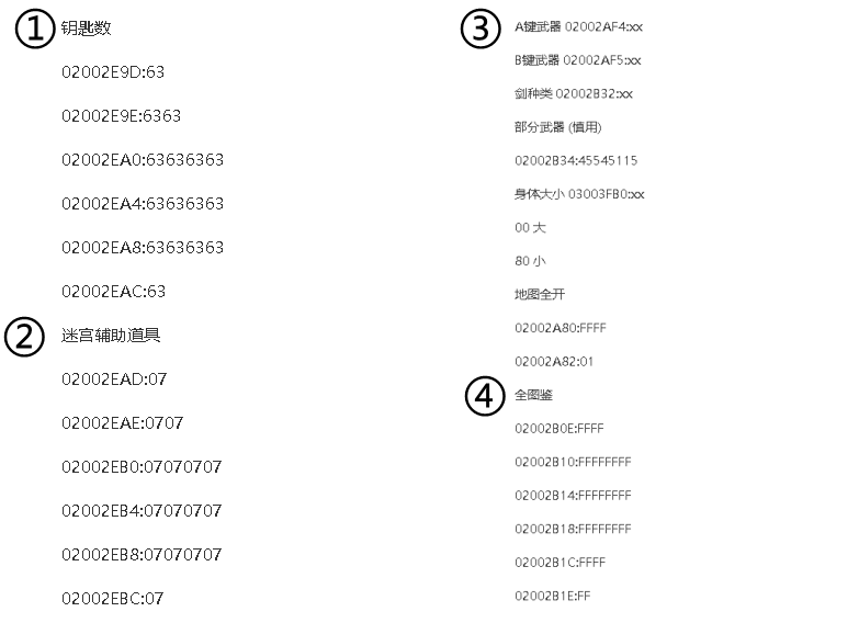 首頁 塞爾達傳說:荒野之息 問答 塞爾達傳說:荒野之息縮小帽金手指代碼是什麼? 2022-09-11 一、塞爾達傳說:縮小帽遊戲中的金手指代碼有增加生命的、增加生命上限的、增加寶石的等等,下圖中是匯總:二、不過要注意適度使用金手指會降低遊戲難度,過度使用金手指會破壞遊戲體驗。下圖是其餘的金手指代碼匯總: