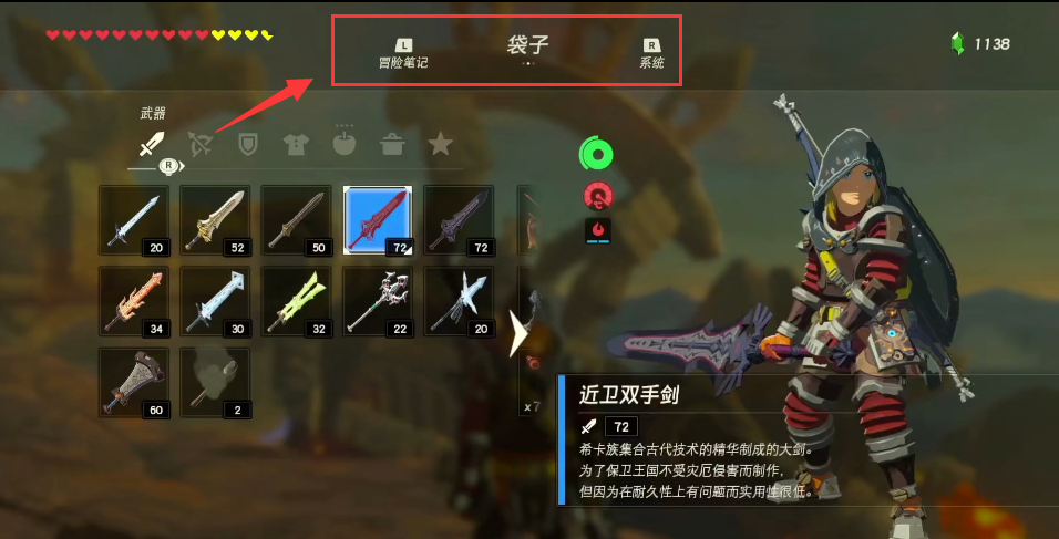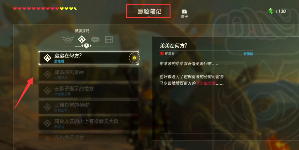 首頁 塞爾達傳說:荒野之息 問答 塞爾達任務列表怎麼打開? 2022-09-11 1.塞爾達打開任務列表首先要先按方向鍵的左鍵,如圖即【切換武器】的按鍵2.進入切換武器界面,上面紅色框框的地方顯示,然後按【L】鍵即可進入【冒險筆記】界面3.如圖進入冒險筆記界面,即打開了任務列表,就可以查看要完成的任務
