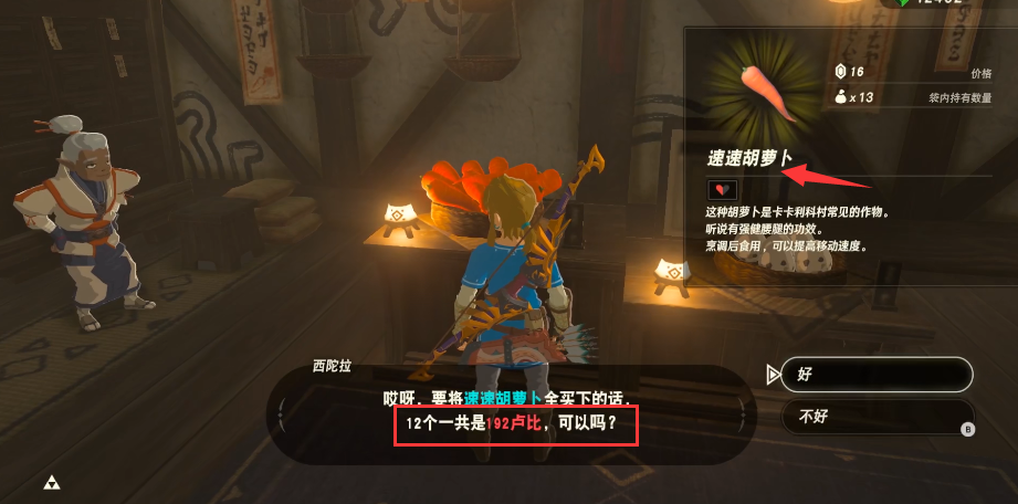 首頁 塞爾達傳說:荒野之息 問答 塞爾達速速胡蘿蔔哪裡最多? 2022-09-17 1.塞爾達速速胡蘿蔔最多的地方是卡卡利科村的雜貨店裡,地圖上的位置如圖所示2.來到卡卡利科村的雜貨店,找店主西陀拉買速速胡蘿蔔,這里一共有12個,每次刷新都可以來買,是最多的地方了