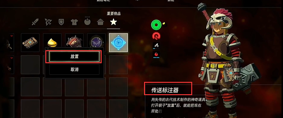 1.塞爾達傳送標注器不需要手動取消,只需要在另外一個地方放置傳送標注器,上一個傳送標注器就自動取消了。如圖,放置傳送標注器