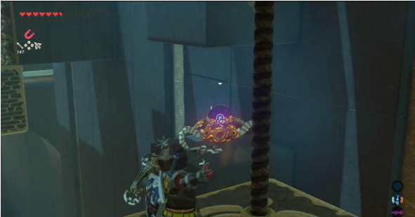 第二部分,在纜車經過的地方會有尖刺,碰到也會掉落到深淵,怕咋纜車側面就不會被碰到。通過第一篇尖刺區域後,站立到纜車上方,隨後三個小柱子上會生成小型古代守護者。守護者發射的激光也會擊落林克,只要我們用弓箭射中守護者就可以將其擊落。
