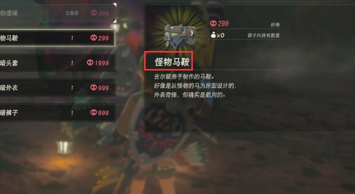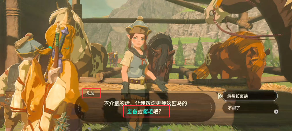 首頁 塞爾達傳說:荒野之息 問答 塞爾達傳說怪物馬鞍和韁繩怎麼戴? 2022-09-27 1.塞爾達傳說穿戴怪物馬鞍和韁繩來到高原驛站這里2.找到喂馬的凡琺,請他幫忙更換3.選擇更換選項,馬鞍和韁繩4.進入之後選擇購買好的怪物馬鞍和怪物韁繩,凡琺就會幫忙穿戴5.如圖所示已經穿戴好了怪物馬鞍和韁繩