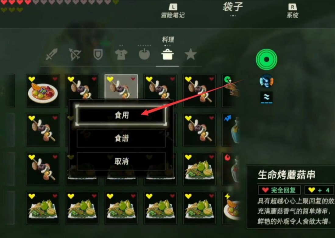 3、進入料理欄後,我們按下A鍵選中生命烤蘑菇串,或者其它可以提升生命上限的食物