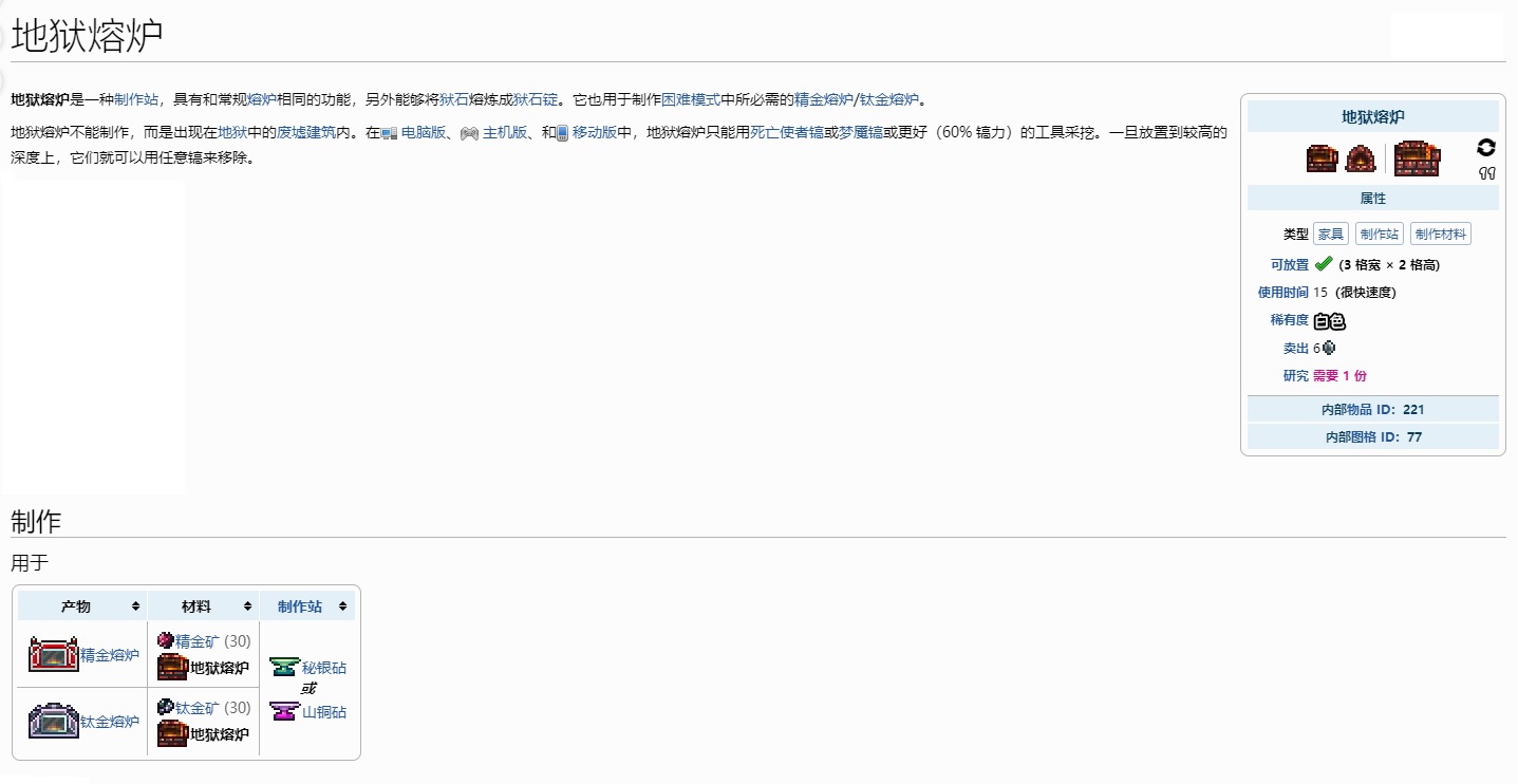 泰拉瑞亞中,地獄熔爐能夠熔煉獄石錠,也用於製作困難模式中所必需的精金熔爐/鈦金熔爐。至於其他作用則和常規熔爐相同。