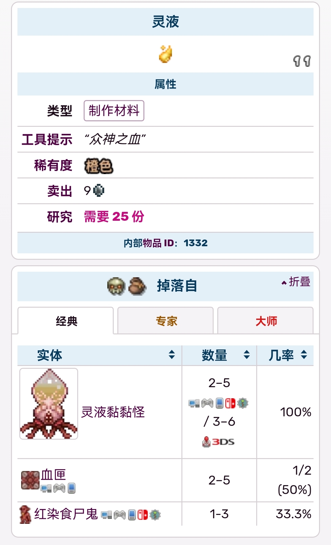 首頁 泰拉瑞亞 問答 泰拉瑞亞靈液怎麼獲得? 2022-10-02 靈液是一個困難模式 製作材料,在困難模式下的地下猩紅之地、猩紅和地下沙漠中,分別由靈液黏黏怪和紅染食屍鬼掉落。它可以用來製作許多靈液相關的物品。它的腐化對應版本是詛咒焰。
