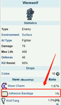 2.狼人掉落:狼人大概在滿月的地表時候刷新,擊敗之後即可獲得繃帶。