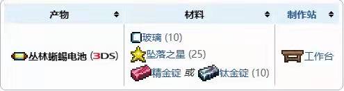 二.3ds是唯一可以製作電池的版本,使用工作台為製作點,消耗25個墜落之星,10個玻璃和10個鈦金錠(精金錠 )製作1個電池。