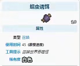 首頁 泰拉瑞亞 問答 泰拉瑞亞蠕蟲誘餌怎麼用? 2022-10-07 泰拉瑞亞蠕蟲誘餌用法介紹:在遊戲《泰拉瑞亞》中,蠕蟲誘餌是一個Boss召喚物品,用於召喚世界吞噬怪,它可以在任意時段使用,但只限於腐化之地(地下腐化之地)中,由30個魔粉、10個腐肉在惡魔祭壇或猩紅祭壇中合成。