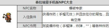 泰拉瑞亞遊戲中的爆破專家需要有一個空的房子,然後有一個爆裂物在你的背包中,道具商人還活著時,爆破專家NPC會出現。