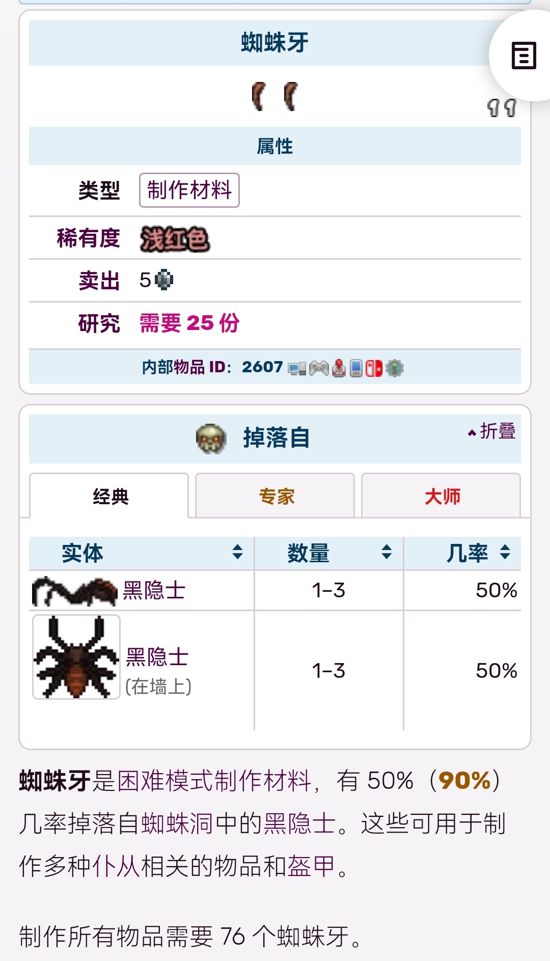 首頁 泰拉瑞亞 問答 泰拉瑞亞蜘蛛牙在哪獲得? 2022-10-11 蜘蛛牙是困難模式製作材料,有 50%(90%)幾率掉落自蜘蛛洞中的黑隱士。這些可用於製作多種仆從相關的物品和盔甲。製作所有物品需要 76 個蜘蛛牙。在困難模式剛開始時,不建議去打黑影士 因為你此時的裝備很大概率是打不過的。