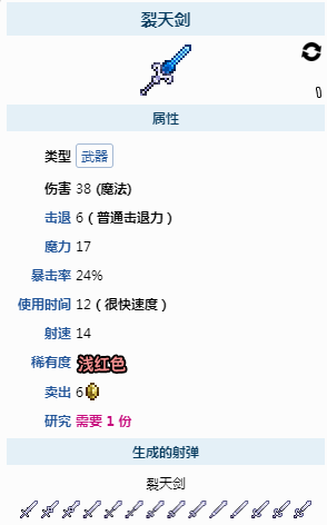 首頁 泰拉瑞亞 問答 泰拉瑞亞裂天劍好不好? 2022-10-14 裂天劍是困難模式的魔法武器,產生的射彈是無法控制的,有別於大部分武器的4%,裂天劍的基礎暴擊率為24%,是一把適合對單的武器,對群怪不利。