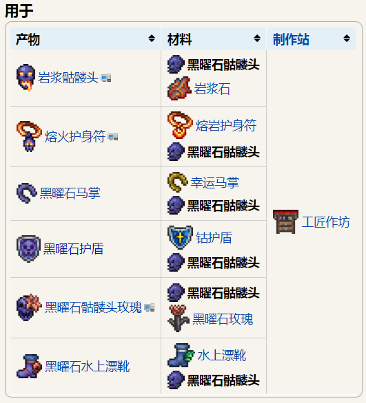 首頁 泰拉瑞亞 問答 泰拉瑞亞黑曜石骷髏頭可以合成什麼? 2022-10-14 泰拉瑞亞黑曜石骷髏頭可以合成岩漿骷髏頭、熔火護身符、黑曜石護盾等等物品,黑曜石骷髏頭是十字章護盾的 4 個能夠在困難模式之前就得到的組件之一,另外 3 個是鈷護盾、邪眼和牛黃。