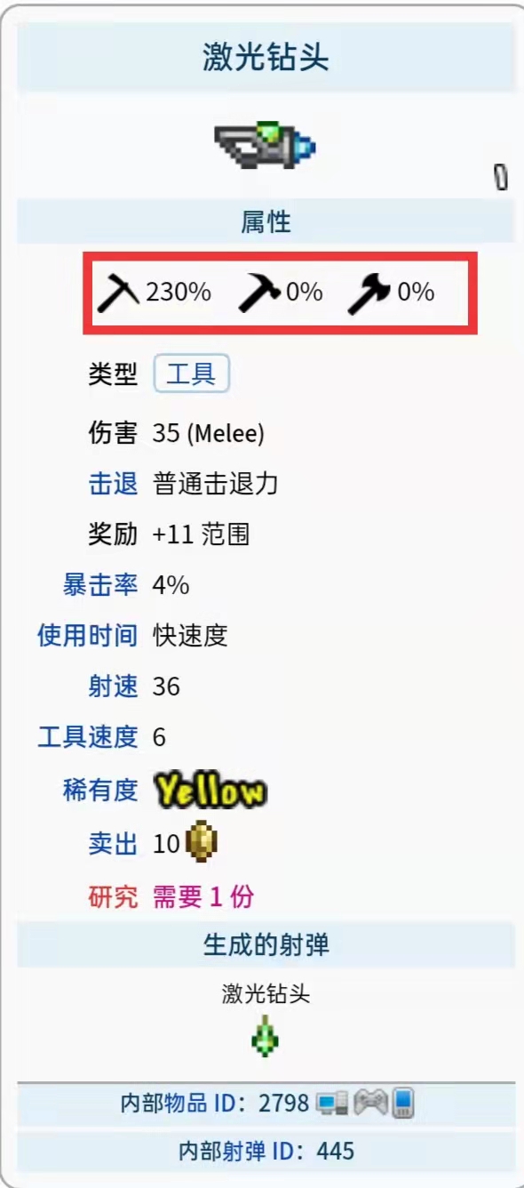首頁 泰拉瑞亞 問答 泰拉瑞亞什麼鎬最快? 2022-10-15 最快的鎬介紹:在遊戲《泰拉瑞亞》中,最快的鎬是指激光鑽頭,是困難模式、石巨人後的鑽頭,從火星暴亂事件中的火星飛碟掉落,擁有所有鎬或鑽頭中最高的鎬力,在整個遊戲中為230%。
