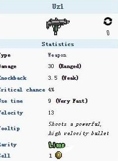 首頁 泰拉瑞亞 問答 泰拉瑞亞烏茲沖鋒槍怎麼獲得? 2022-10-15 泰拉瑞亞中的烏茲沖鋒槍是肉山後的武器,玩家可以從憤怒捕手身上獲得烏茲沖鋒槍,擁有較高的彈速、射速和傷害,不過並不會增加傷害,如下圖所示: