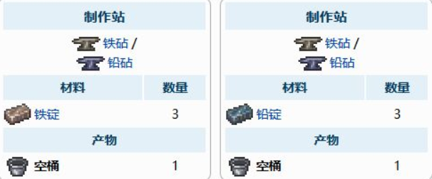 3、鐵礦在熔爐處煉成鐵錠,在鐵砧處選擇空桶;用三個鐵錠就可以合成桶了。