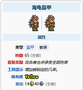 首頁 泰拉瑞亞 問答 泰拉瑞亞海龜套屬性怎麼樣? 2022-10-16 海龜盔甲屬性挺好的,它的防禦力高達65點,套裝獎勵具有荊棘效果,能夠反彈一部分傷害給怪物,還能夠提供14%的近戰傷害和12%的近戰暴擊率。