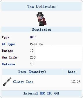 首頁 泰拉瑞亞 問答 泰拉瑞亞收稅官有什麼用? 2022-10-16 1.收稅官是肉山後的一個NPC,可以通過向其他NPC徵稅來獲取金幣。2.收稅官每分鍾(現實時間60秒)向所有npc每人徵收50銅 ,上限10金。