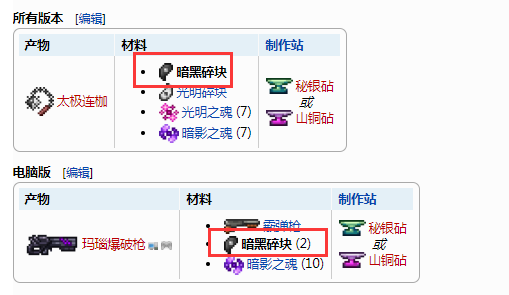 泰拉瑞亞暗黑碎塊是一個困難模式下的製作材料,是用於合成太極連枷和瑪瑙爆破槍的材料之一。暗黑碎塊具體可合成物品如下: