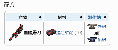 首頁 泰拉瑞亞 問答 泰拉瑞亞血腥之刃怎麼做? 2022-10-17 在泰拉瑞亞遊戲中,血腥之刃(血腥屠刀)製作方法為使用10個猩紅礦錠在鐵砧或鉛砧合成獲得。血腥屠刀是魔光劍的猩紅版本,因此可以作為替代品用於鑄造永夜刃。雖然它明顯比魔光劍更大更有殺傷力,但它攻擊更慢。