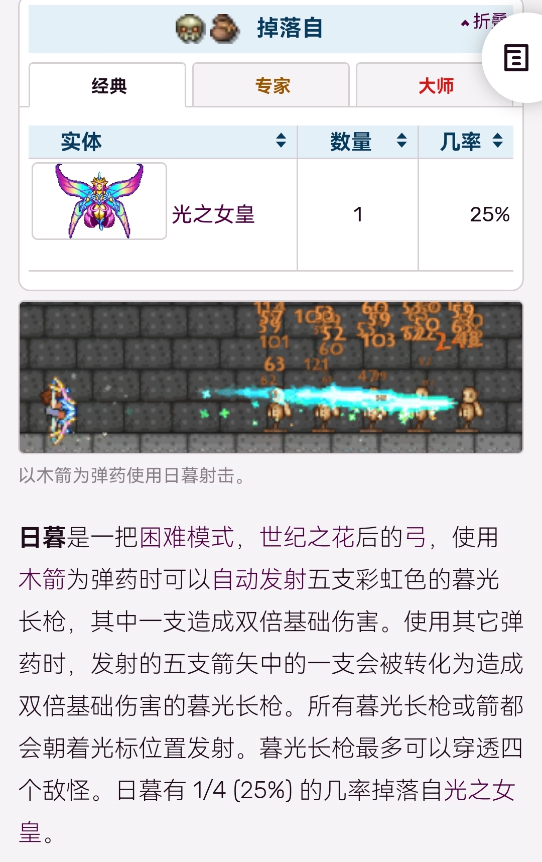 首頁 泰拉瑞亞 問答 泰拉瑞亞黃昏弓怎麼得? 2022-10-18 黃昏弓它的正確名字是日暮,它是通過打敗光之女皇掉落的,打敗光之女皇,有25%的幾率掉落它,日暮是泰拉瑞亞當中最頂尖的弓之一,無最好搭配無盡箭袋使用。