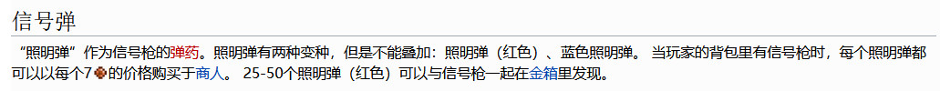 信號槍的子彈是無法進行製作的,信號槍的子彈只能通過在寶箱裡面同信號槍一起獲得,或者是在商人處進行購買,從寶箱當中獲得的照明彈,發出的只會是紅光而購買獲得的,有可能會買到藍色的照明彈。照明彈的攻擊力並不高,它一般是在困難模式之前為玩家提供照明。