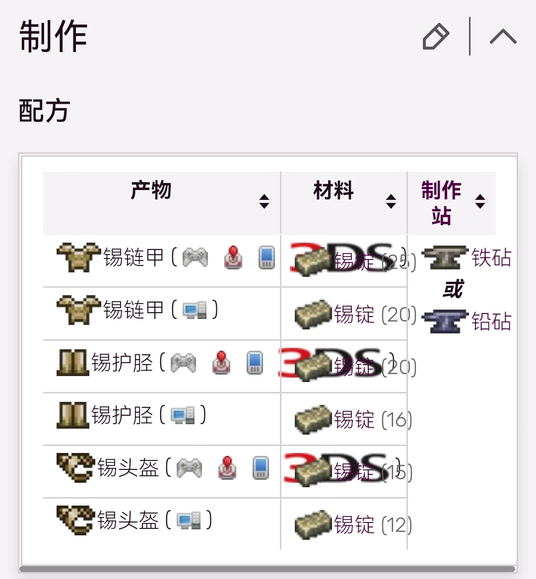 錫盔甲是銅盔甲的錫對應物,也是遊戲中最容易製作的盔甲套裝之一。製作一整套盔甲總共需要耗費48/60 個錫錠,或者說需要耗費144/180 個錫礦。一整套盔甲可提供 5 點基礎防禦,外加 2 點套裝獎勵提供的防禦,一共加起來是 7 點防禦。這意味著一整套錫盔甲可比其銅對應物多提供 1 點防禦。