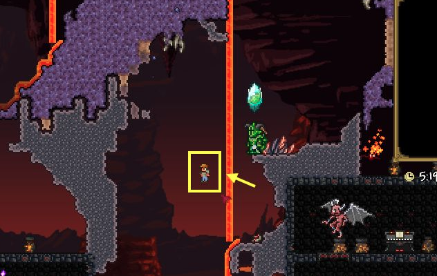 2、最後玩家來到有岩漿的地方,這里就是地獄。將向導巫毒娃娃扔進地獄岩漿中,召喚肉山將其殺死,遊戲轉為永久困難模式。