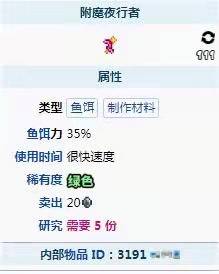 泰拉瑞亞遊戲里的附魔夜行者是一種小動物,外表是粉紅閃亮的蠕蟲。它可以由玩家製作,玩家可以徒手用蠕蟲和墜落之星製作獲得附魔夜行者。在夜晚有極小概率或在流星雨期間自然生成。它可以用作魚餌或放置在世界中,此時其行為與常規蠕蟲完全相同。附魔夜行者除了作為魚餌有著35%魚餌力外沒有任何功能性用途。