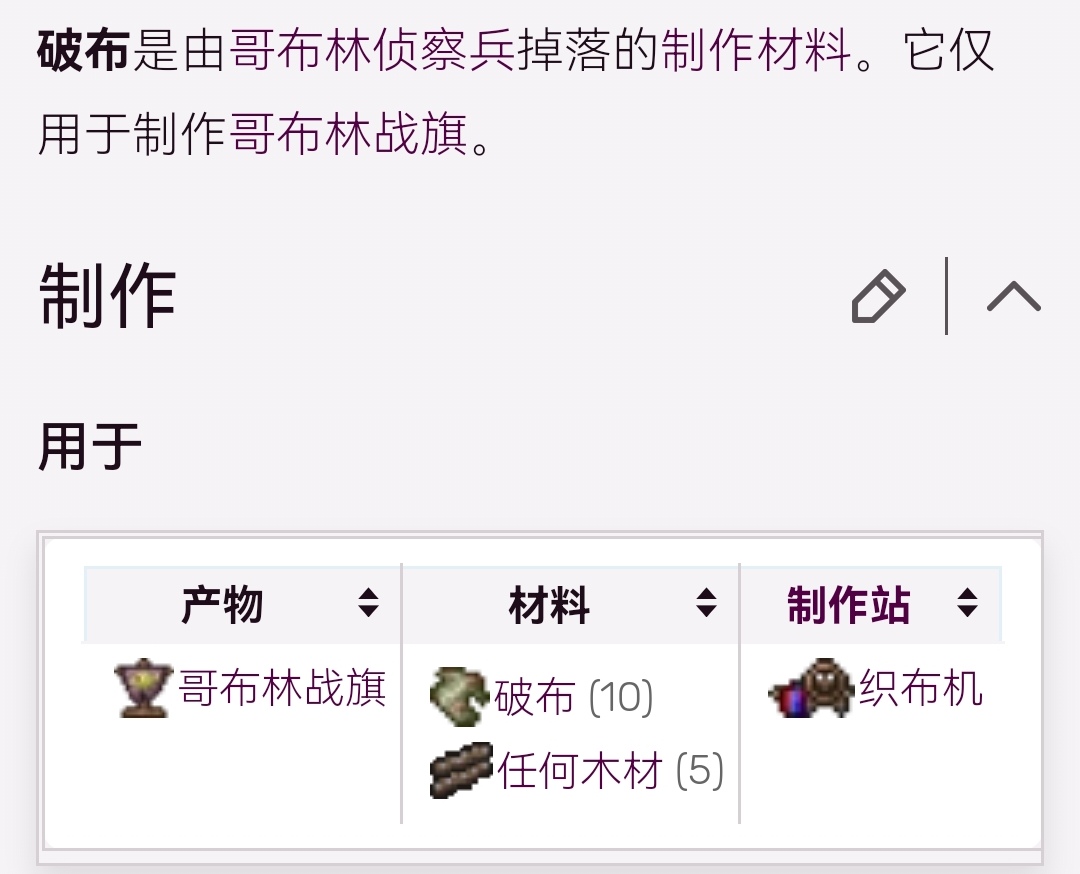 首頁 泰拉瑞亞 問答 泰拉瑞亞破布有什麼用? 2022-10-19 破布是由哥布林偵察兵掉落的製作材料,哥布林偵察兵僅生成於世界的兩側,同時這里還有可能生成史萊姆王,哥布林偵察兵掉落的破布僅用於製作哥布林戰旗,可以用來召喚哥布林事件。