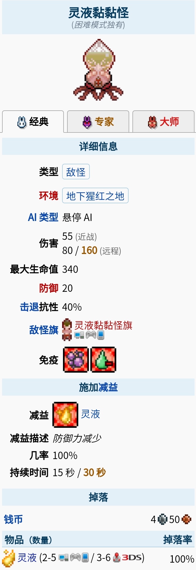 靈液是一個困難模式的製作材料,在困難模式下的地下猩紅之地、猩紅和地下沙漠中,分別由靈液黏黏怪和紅染食屍鬼掉落。