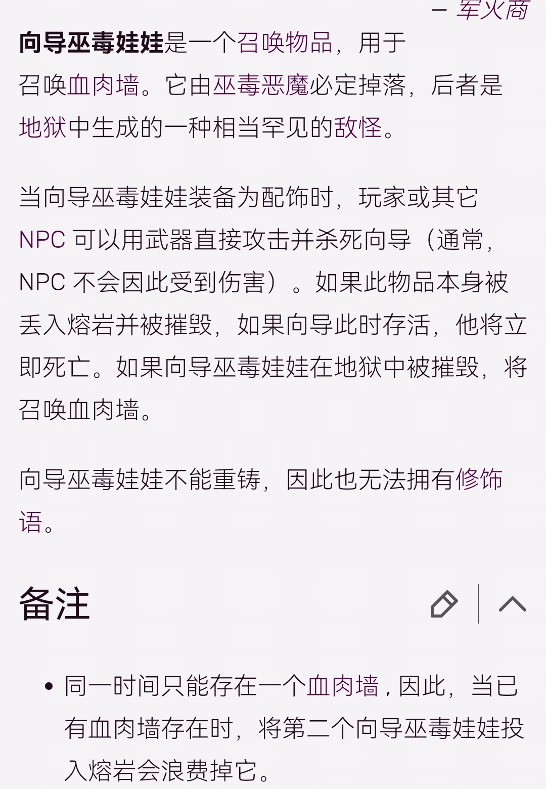 首頁 泰拉瑞亞 問答 泰拉瑞亞巫毒娃娃扔了沒反應怎麼辦? 2022-10-20 扔到岩漿里沒有反應,主要是以下幾種情況,一已經存在血肉牆,此時再將向導巫毒娃娃扔到岩漿里是毫無作用的,二向導已經死亡,所以將巫毒娃娃扔到岩漿里也毫無作用,三沒有將巫毒娃娃扔到地獄里的岩漿當中,所以也不能召喚出血肉boss。